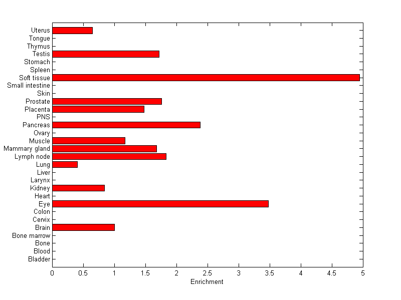 The expression level is normalized with tissue-library size. Each value for a gene in a tissue is a ratio of observed ESTs to the expected one in this tissue. The expected number of ESTs is the product of total ESTs of the gene and the fraction of total ESTs in the tissue among all ESTs in 30 tissues.
