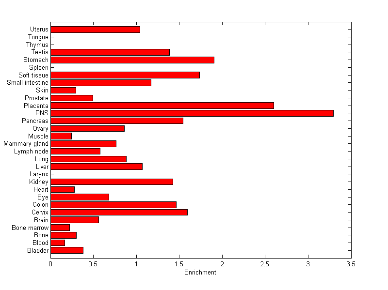 The expression level is normalized with tissue-library size. Each value for a gene in a tissue is a ratio of observed ESTs to the expected one in this tissue. The expected number of ESTs is the product of total ESTs of the gene and the fraction of total ESTs in the tissue among all ESTs in 30 tissues.