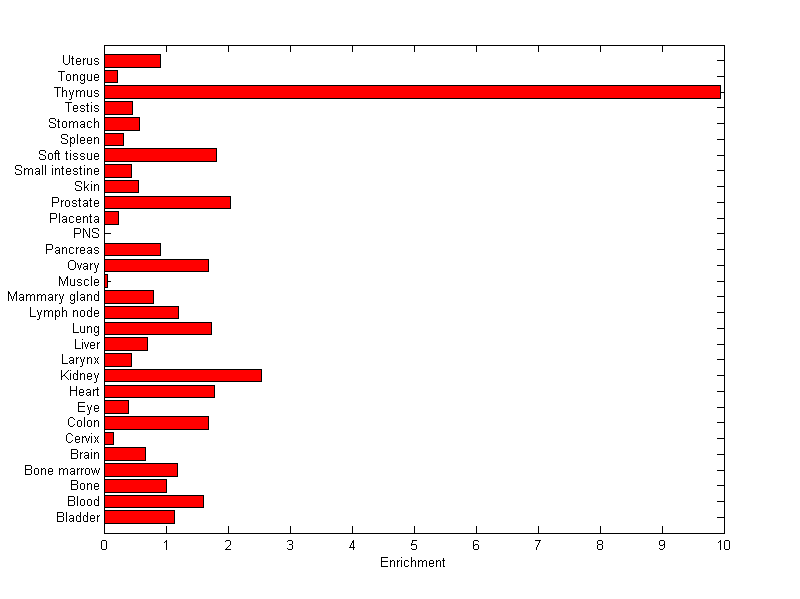The expression level is normalized with tissue-library size. Each value for a gene in a tissue is a ratio of observed ESTs to the expected one in this tissue. The expected number of ESTs is the product of total ESTs of the gene and the fraction of total ESTs in the tissue among all ESTs in 30 tissues.