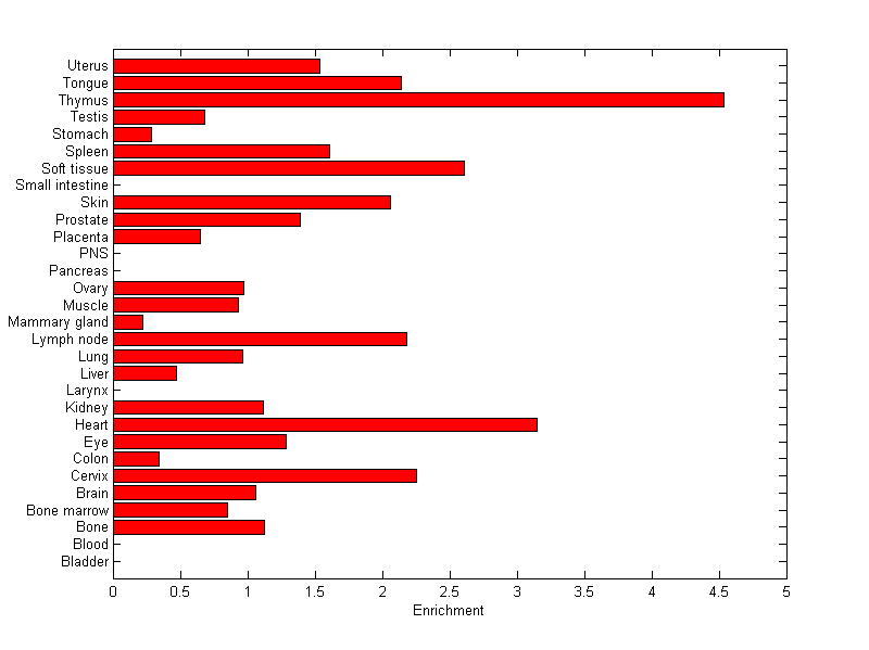 The expression level is normalized with tissue-library size. Each value for a gene in a tissue is a ratio of observed ESTs to the expected one in this tissue. The expected number of ESTs is the product of total ESTs of the gene and the fraction of total ESTs in the tissue among all ESTs in 30 tissues.