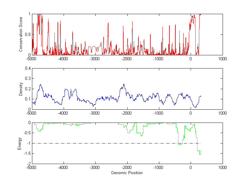 The energy profile (green curve) is about energy for module detection based on TF interaction. The positions with energy less than -1 indicate the existence of CRMs.