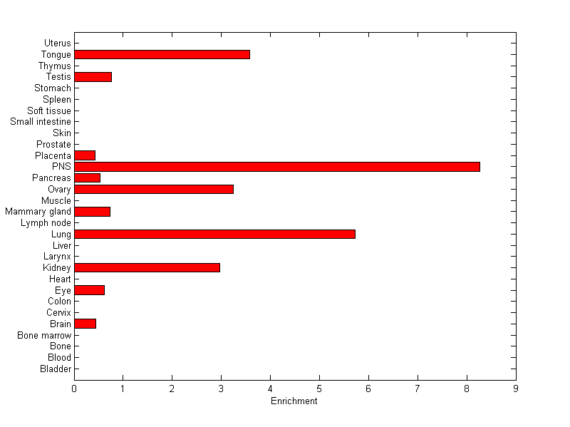 The expression level is normalized with tissue-library size. Each value for a gene in a tissue is a ratio of observed ESTs to the expected one in this tissue. The expected number of ESTs is the product of total ESTs of the gene and the fraction of total ESTs in the tissue among all ESTs in 30 tissues.