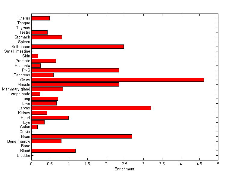 The expression level is normalized with tissue-library size. Each value for a gene in a tissue is a ratio of observed ESTs to the expected one in this tissue. The expected number of ESTs is the product of total ESTs of the gene and the fraction of total ESTs in the tissue among all ESTs in 30 tissues.