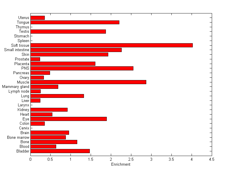 The expression level is normalized with tissue-library size. Each value for a gene in a tissue is a ratio of observed ESTs to the expected one in this tissue. The expected number of ESTs is the product of total ESTs of the gene and the fraction of total ESTs in the tissue among all ESTs in 30 tissues.