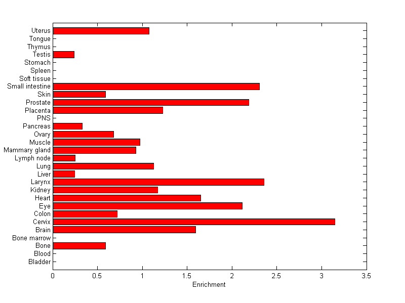The expression level is normalized with tissue-library size. Each value for a gene in a tissue is a ratio of observed ESTs to the expected one in this tissue. The expected number of ESTs is the product of total ESTs of the gene and the fraction of total ESTs in the tissue among all ESTs in 30 tissues.