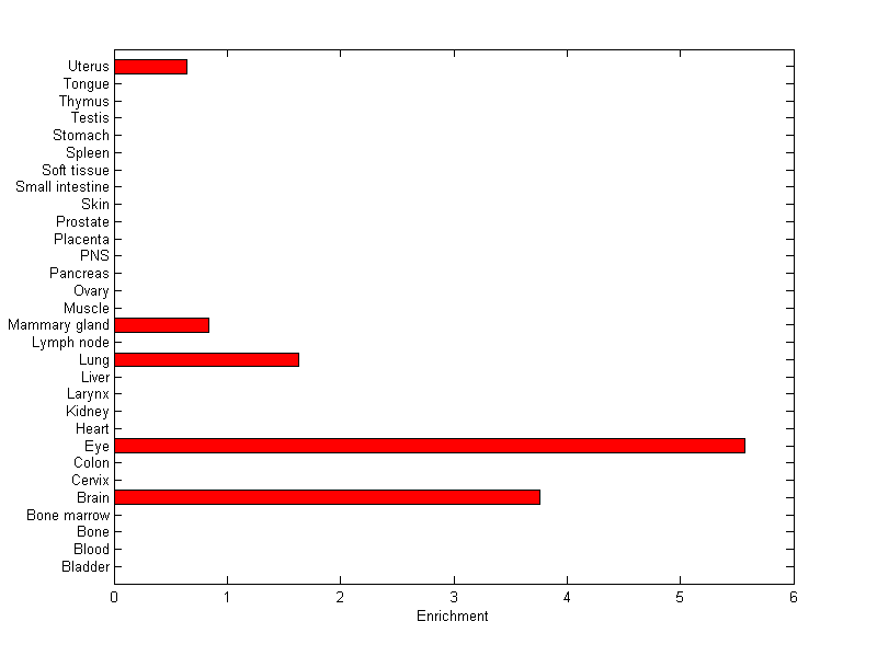 The expression level is normalized with tissue-library size. Each value for a gene in a tissue is a ratio of observed ESTs to the expected one in this tissue. The expected number of ESTs is the product of total ESTs of the gene and the fraction of total ESTs in the tissue among all ESTs in 30 tissues.