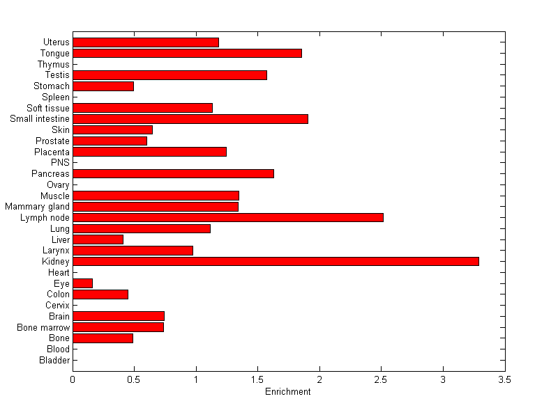 The expression level is normalized with tissue-library size. Each value for a gene in a tissue is a ratio of observed ESTs to the expected one in this tissue. The expected number of ESTs is the product of total ESTs of the gene and the fraction of total ESTs in the tissue among all ESTs in 30 tissues.