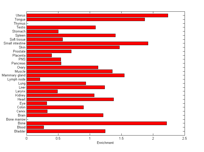 The expression level is normalized with tissue-library size. Each value for a gene in a tissue is a ratio of observed ESTs to the expected one in this tissue. The expected number of ESTs is the product of total ESTs of the gene and the fraction of total ESTs in the tissue among all ESTs in 30 tissues.