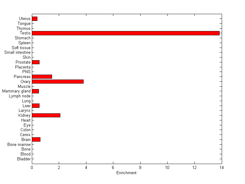 The expression level is normalized with tissue-library size. Each value for a gene in a tissue is a ratio of observed ESTs to the expected one in this tissue. The expected number of ESTs is the product of total ESTs of the gene and the fraction of total ESTs in the tissue among all ESTs in 30 tissues.
