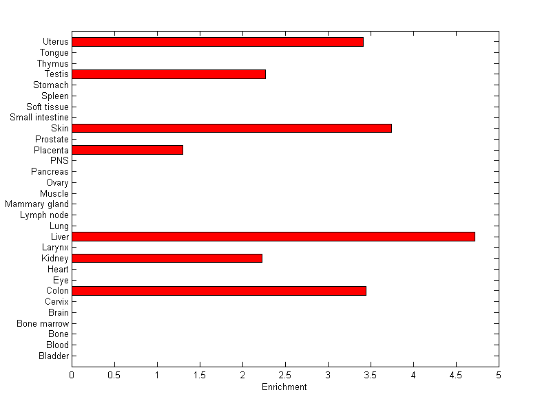 The expression level is normalized with tissue-library size. Each value for a gene in a tissue is a ratio of observed ESTs to the expected one in this tissue. The expected number of ESTs is the product of total ESTs of the gene and the fraction of total ESTs in the tissue among all ESTs in 30 tissues.