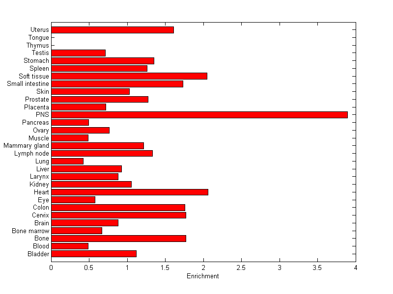 The expression level is normalized with tissue-library size. Each value for a gene in a tissue is a ratio of observed ESTs to the expected one in this tissue. The expected number of ESTs is the product of total ESTs of the gene and the fraction of total ESTs in the tissue among all ESTs in 30 tissues.
