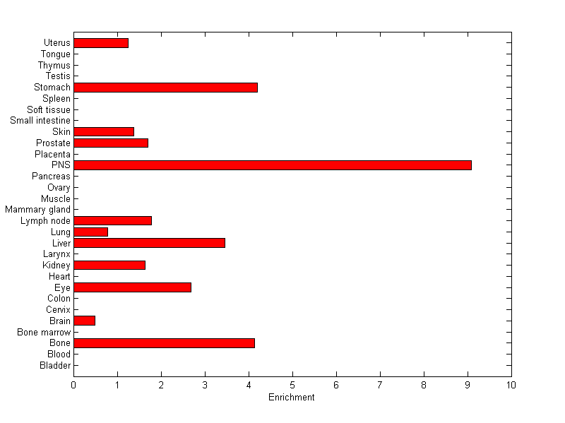 The expression level is normalized with tissue-library size. Each value for a gene in a tissue is a ratio of observed ESTs to the expected one in this tissue. The expected number of ESTs is the product of total ESTs of the gene and the fraction of total ESTs in the tissue among all ESTs in 30 tissues.