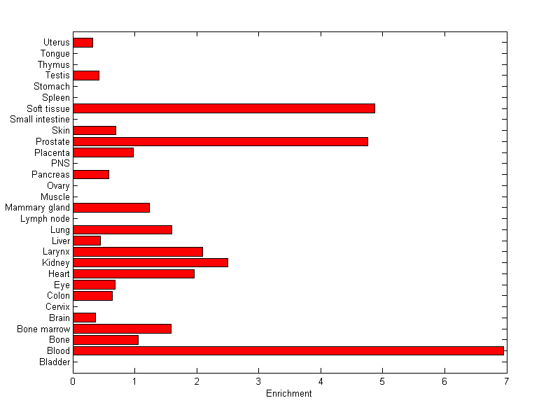 The expression level is normalized with tissue-library size. Each value for a gene in a tissue is a ratio of observed ESTs to the expected one in this tissue. The expected number of ESTs is the product of total ESTs of the gene and the fraction of total ESTs in the tissue among all ESTs in 30 tissues.
