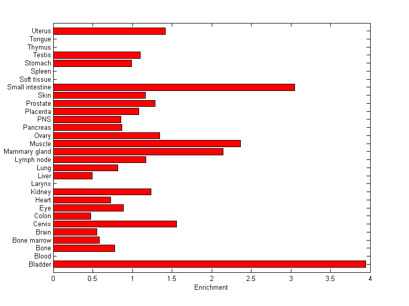 The expression level is normalized with tissue-library size. Each value for a gene in a tissue is a ratio of observed ESTs to the expected one in this tissue. The expected number of ESTs is the product of total ESTs of the gene and the fraction of total ESTs in the tissue among all ESTs in 30 tissues.