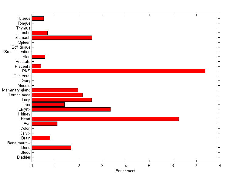 The expression level is normalized with tissue-library size. Each value for a gene in a tissue is a ratio of observed ESTs to the expected one in this tissue. The expected number of ESTs is the product of total ESTs of the gene and the fraction of total ESTs in the tissue among all ESTs in 30 tissues.