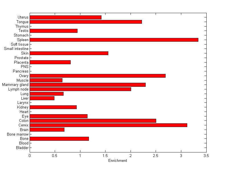 The expression level is normalized with tissue-library size. Each value for a gene in a tissue is a ratio of observed ESTs to the expected one in this tissue. The expected number of ESTs is the product of total ESTs of the gene and the fraction of total ESTs in the tissue among all ESTs in 30 tissues.