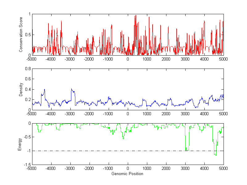 The energy profile (green curve) is about energy for module detection based on TF interaction. The positions with energy less than -1 indicate the existence of CRMs.