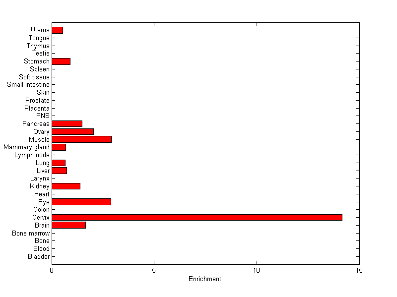The expression level is normalized with tissue-library size. Each value for a gene in a tissue is a ratio of observed ESTs to the expected one in this tissue. The expected number of ESTs is the product of total ESTs of the gene and the fraction of total ESTs in the tissue among all ESTs in 30 tissues.