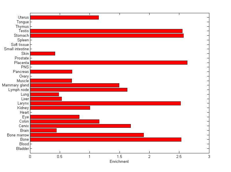 The expression level is normalized with tissue-library size. Each value for a gene in a tissue is a ratio of observed ESTs to the expected one in this tissue. The expected number of ESTs is the product of total ESTs of the gene and the fraction of total ESTs in the tissue among all ESTs in 30 tissues.
