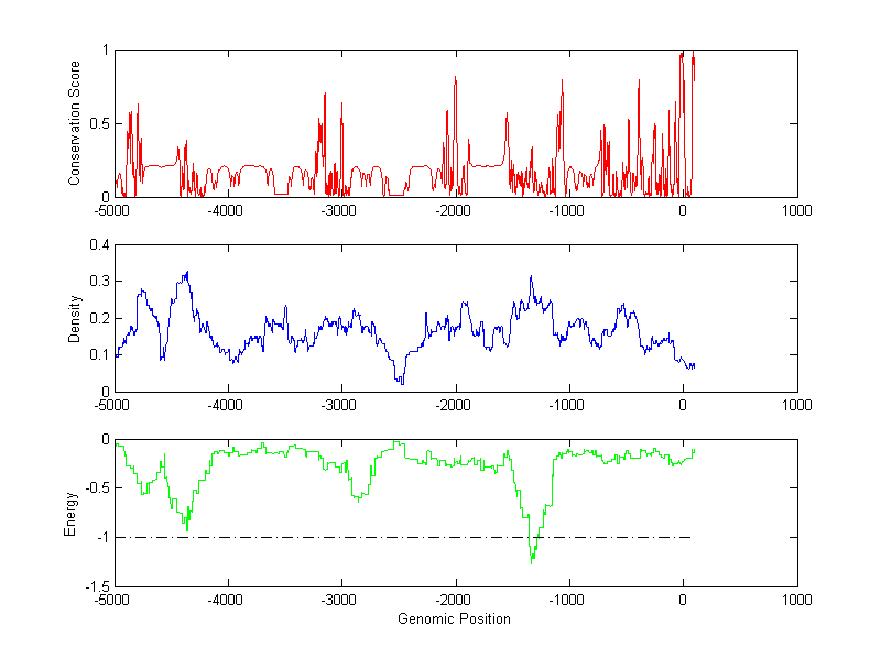 The energy profile (green curve) is about energy for module detection based on TF interaction. The positions with energy less than -1 indicate the existence of CRMs.
