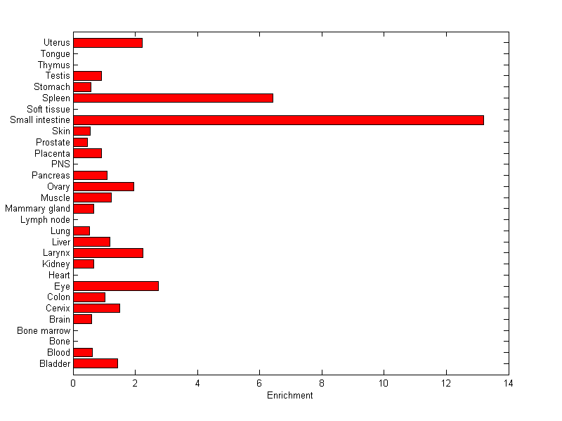 The expression level is normalized with tissue-library size. Each value for a gene in a tissue is a ratio of observed ESTs to the expected one in this tissue. The expected number of ESTs is the product of total ESTs of the gene and the fraction of total ESTs in the tissue among all ESTs in 30 tissues.