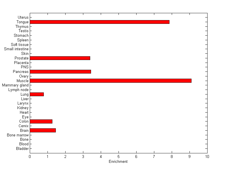 The expression level is normalized with tissue-library size. Each value for a gene in a tissue is a ratio of observed ESTs to the expected one in this tissue. The expected number of ESTs is the product of total ESTs of the gene and the fraction of total ESTs in the tissue among all ESTs in 30 tissues.