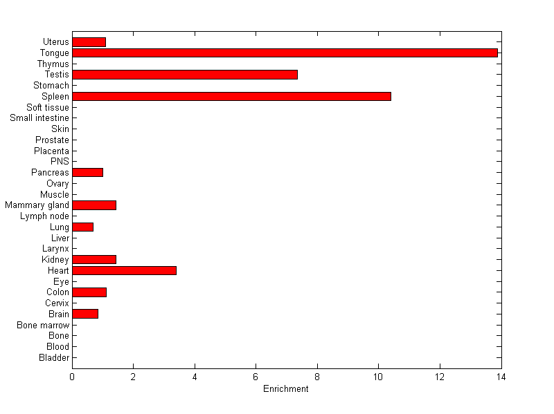 The expression level is normalized with tissue-library size. Each value for a gene in a tissue is a ratio of observed ESTs to the expected one in this tissue. The expected number of ESTs is the product of total ESTs of the gene and the fraction of total ESTs in the tissue among all ESTs in 30 tissues.