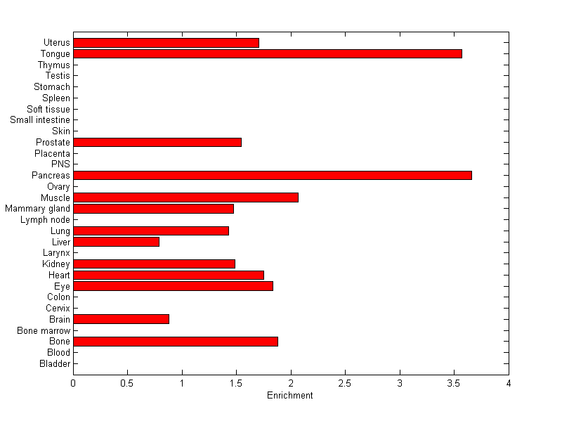 The expression level is normalized with tissue-library size. Each value for a gene in a tissue is a ratio of observed ESTs to the expected one in this tissue. The expected number of ESTs is the product of total ESTs of the gene and the fraction of total ESTs in the tissue among all ESTs in 30 tissues.