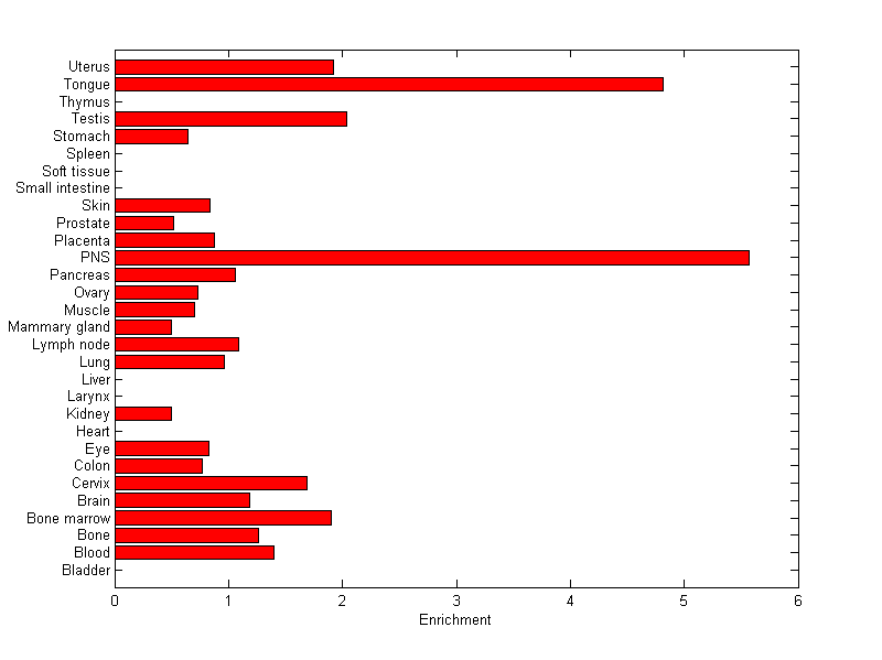 The expression level is normalized with tissue-library size. Each value for a gene in a tissue is a ratio of observed ESTs to the expected one in this tissue. The expected number of ESTs is the product of total ESTs of the gene and the fraction of total ESTs in the tissue among all ESTs in 30 tissues.