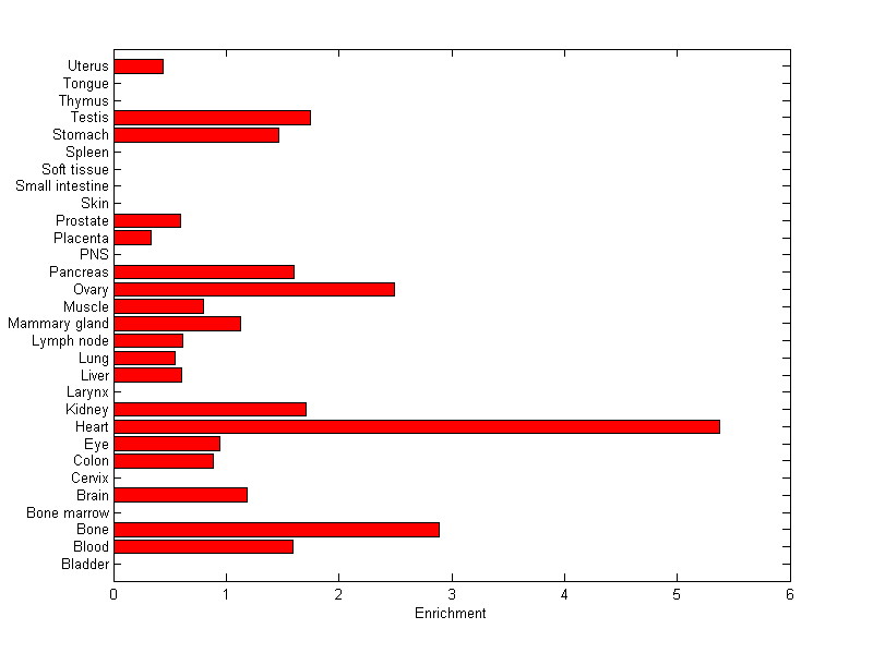 The expression level is normalized with tissue-library size. Each value for a gene in a tissue is a ratio of observed ESTs to the expected one in this tissue. The expected number of ESTs is the product of total ESTs of the gene and the fraction of total ESTs in the tissue among all ESTs in 30 tissues.