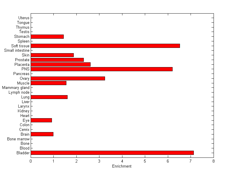 The expression level is normalized with tissue-library size. Each value for a gene in a tissue is a ratio of observed ESTs to the expected one in this tissue. The expected number of ESTs is the product of total ESTs of the gene and the fraction of total ESTs in the tissue among all ESTs in 30 tissues.
