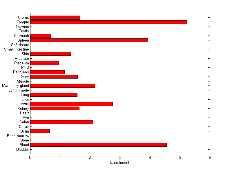 The expression level is normalized with tissue-library size. Each value for a gene in a tissue is a ratio of observed ESTs to the expected one in this tissue. The expected number of ESTs is the product of total ESTs of the gene and the fraction of total ESTs in the tissue among all ESTs in 30 tissues.