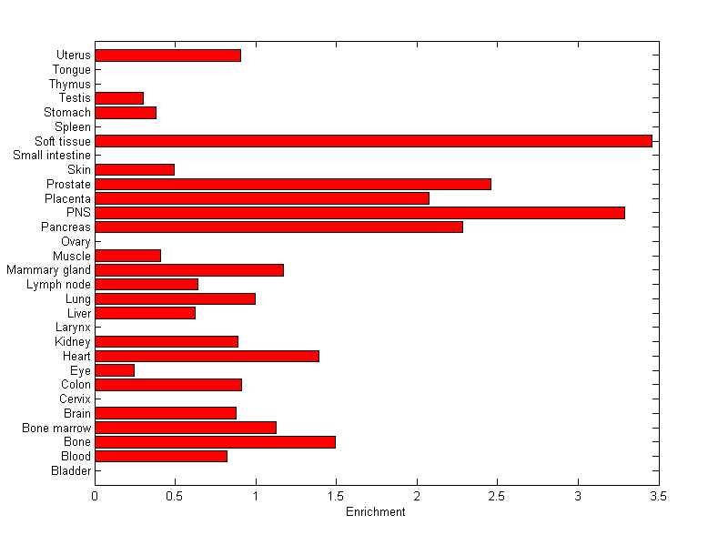 The expression level is normalized with tissue-library size. Each value for a gene in a tissue is a ratio of observed ESTs to the expected one in this tissue. The expected number of ESTs is the product of total ESTs of the gene and the fraction of total ESTs in the tissue among all ESTs in 30 tissues.