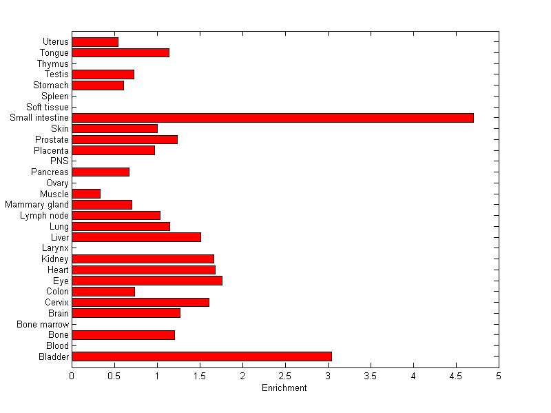 The expression level is normalized with tissue-library size. Each value for a gene in a tissue is a ratio of observed ESTs to the expected one in this tissue. The expected number of ESTs is the product of total ESTs of the gene and the fraction of total ESTs in the tissue among all ESTs in 30 tissues.