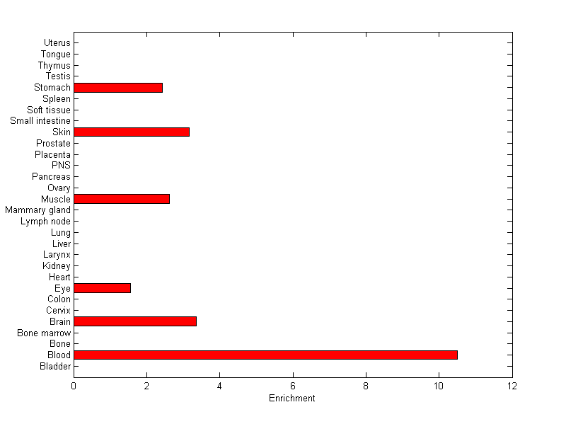 The expression level is normalized with tissue-library size. Each value for a gene in a tissue is a ratio of observed ESTs to the expected one in this tissue. The expected number of ESTs is the product of total ESTs of the gene and the fraction of total ESTs in the tissue among all ESTs in 30 tissues.
