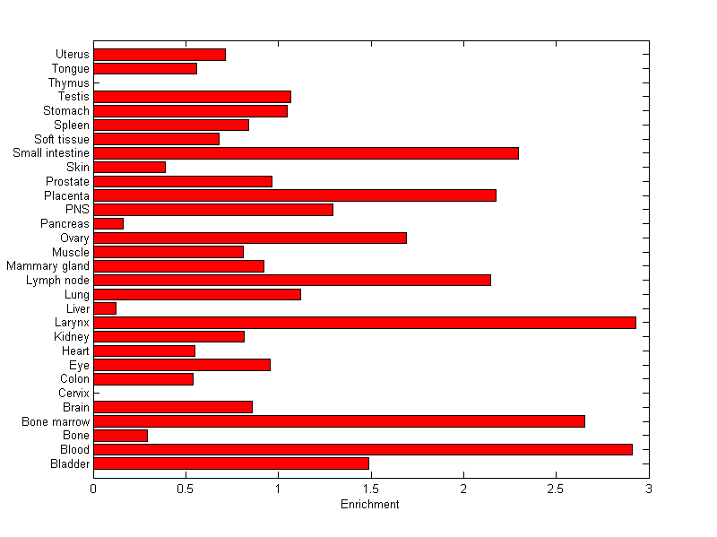 The expression level is normalized with tissue-library size. Each value for a gene in a tissue is a ratio of observed ESTs to the expected one in this tissue. The expected number of ESTs is the product of total ESTs of the gene and the fraction of total ESTs in the tissue among all ESTs in 30 tissues.