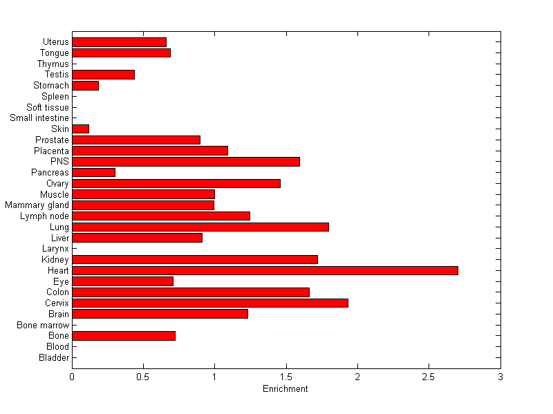 The expression level is normalized with tissue-library size. Each value for a gene in a tissue is a ratio of observed ESTs to the expected one in this tissue. The expected number of ESTs is the product of total ESTs of the gene and the fraction of total ESTs in the tissue among all ESTs in 30 tissues.