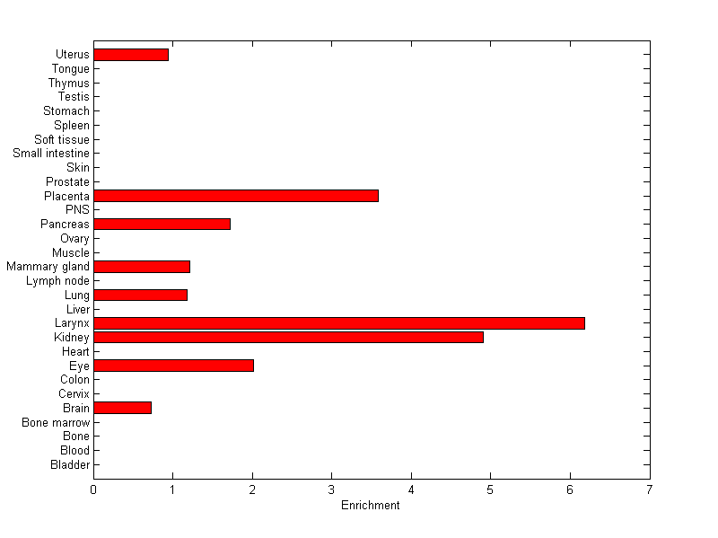The expression level is normalized with tissue-library size. Each value for a gene in a tissue is a ratio of observed ESTs to the expected one in this tissue. The expected number of ESTs is the product of total ESTs of the gene and the fraction of total ESTs in the tissue among all ESTs in 30 tissues.