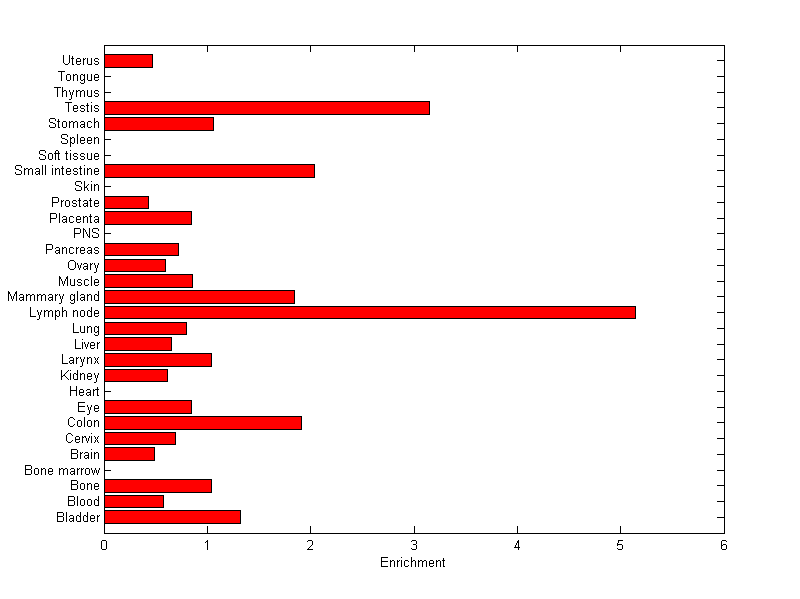 The expression level is normalized with tissue-library size. Each value for a gene in a tissue is a ratio of observed ESTs to the expected one in this tissue. The expected number of ESTs is the product of total ESTs of the gene and the fraction of total ESTs in the tissue among all ESTs in 30 tissues.