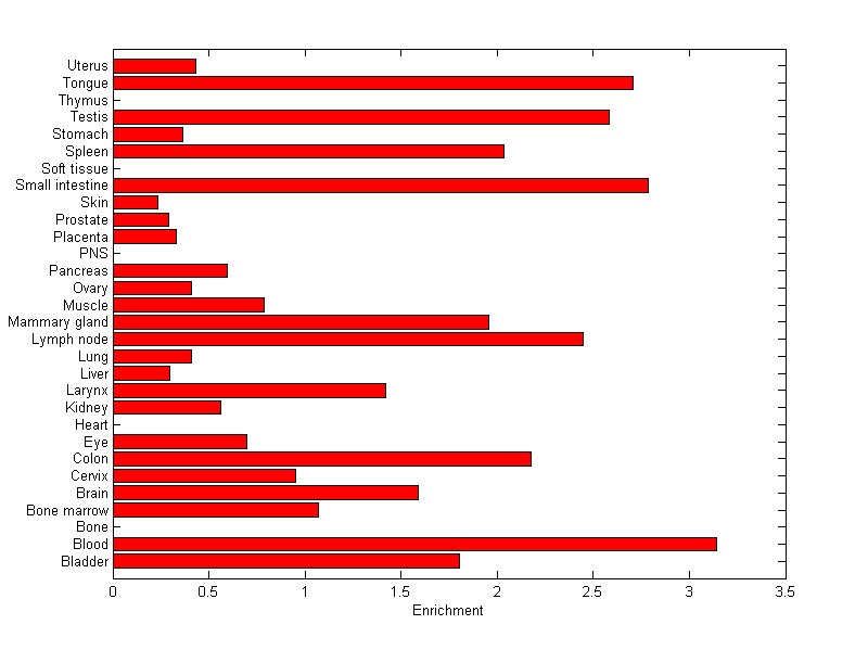 The expression level is normalized with tissue-library size. Each value for a gene in a tissue is a ratio of observed ESTs to the expected one in this tissue. The expected number of ESTs is the product of total ESTs of the gene and the fraction of total ESTs in the tissue among all ESTs in 30 tissues.
