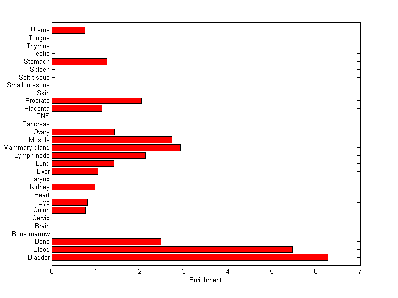 The expression level is normalized with tissue-library size. Each value for a gene in a tissue is a ratio of observed ESTs to the expected one in this tissue. The expected number of ESTs is the product of total ESTs of the gene and the fraction of total ESTs in the tissue among all ESTs in 30 tissues.