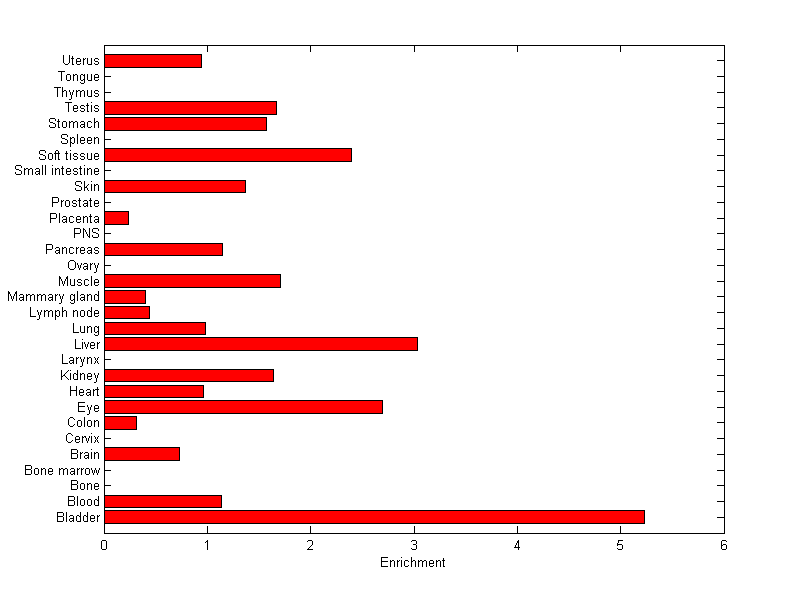 The expression level is normalized with tissue-library size. Each value for a gene in a tissue is a ratio of observed ESTs to the expected one in this tissue. The expected number of ESTs is the product of total ESTs of the gene and the fraction of total ESTs in the tissue among all ESTs in 30 tissues.