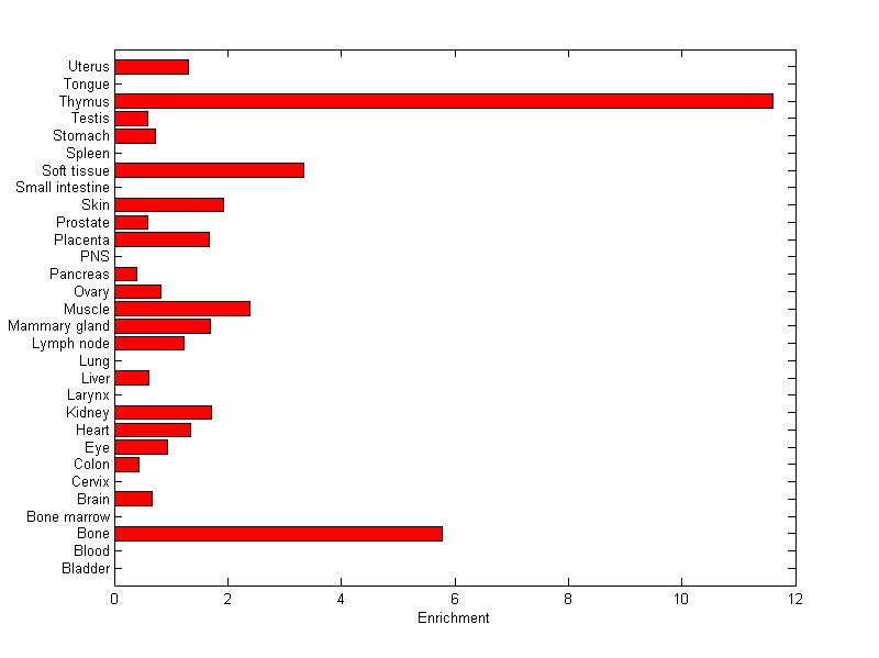 The expression level is normalized with tissue-library size. Each value for a gene in a tissue is a ratio of observed ESTs to the expected one in this tissue. The expected number of ESTs is the product of total ESTs of the gene and the fraction of total ESTs in the tissue among all ESTs in 30 tissues.