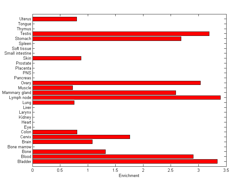 The expression level is normalized with tissue-library size. Each value for a gene in a tissue is a ratio of observed ESTs to the expected one in this tissue. The expected number of ESTs is the product of total ESTs of the gene and the fraction of total ESTs in the tissue among all ESTs in 30 tissues.