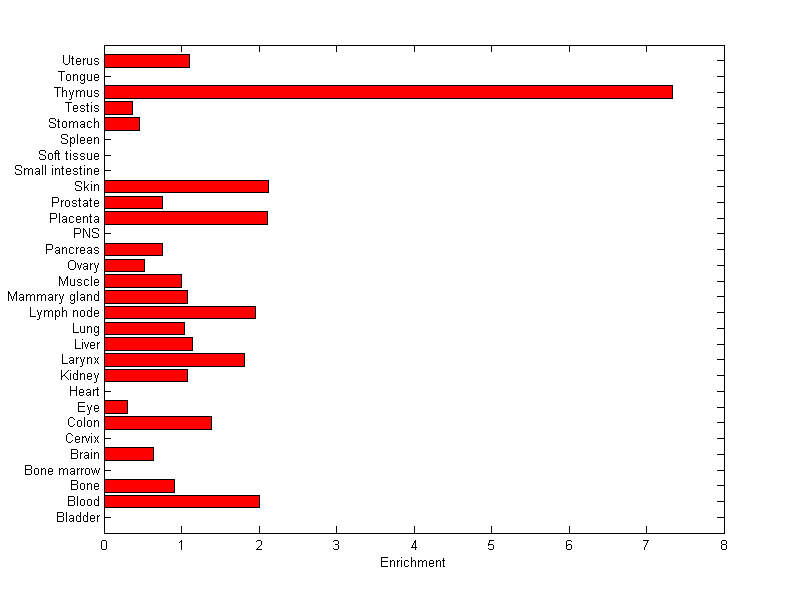 The expression level is normalized with tissue-library size. Each value for a gene in a tissue is a ratio of observed ESTs to the expected one in this tissue. The expected number of ESTs is the product of total ESTs of the gene and the fraction of total ESTs in the tissue among all ESTs in 30 tissues.