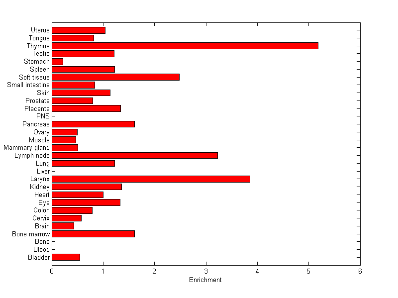The expression level is normalized with tissue-library size. Each value for a gene in a tissue is a ratio of observed ESTs to the expected one in this tissue. The expected number of ESTs is the product of total ESTs of the gene and the fraction of total ESTs in the tissue among all ESTs in 30 tissues.