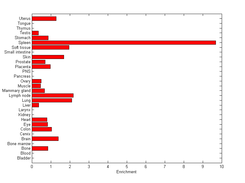 The expression level is normalized with tissue-library size. Each value for a gene in a tissue is a ratio of observed ESTs to the expected one in this tissue. The expected number of ESTs is the product of total ESTs of the gene and the fraction of total ESTs in the tissue among all ESTs in 30 tissues.