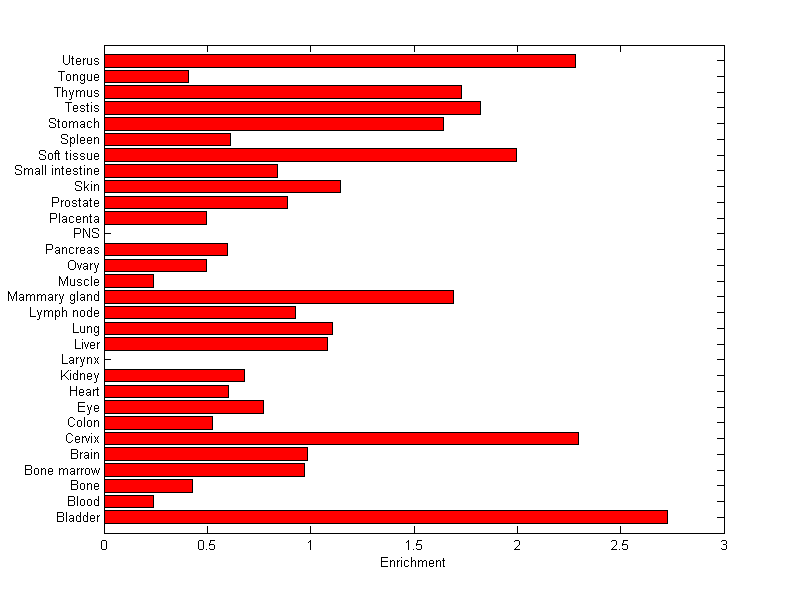 The expression level is normalized with tissue-library size. Each value for a gene in a tissue is a ratio of observed ESTs to the expected one in this tissue. The expected number of ESTs is the product of total ESTs of the gene and the fraction of total ESTs in the tissue among all ESTs in 30 tissues.