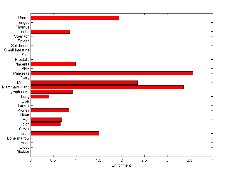 The expression level is normalized with tissue-library size. Each value for a gene in a tissue is a ratio of observed ESTs to the expected one in this tissue. The expected number of ESTs is the product of total ESTs of the gene and the fraction of total ESTs in the tissue among all ESTs in 30 tissues.