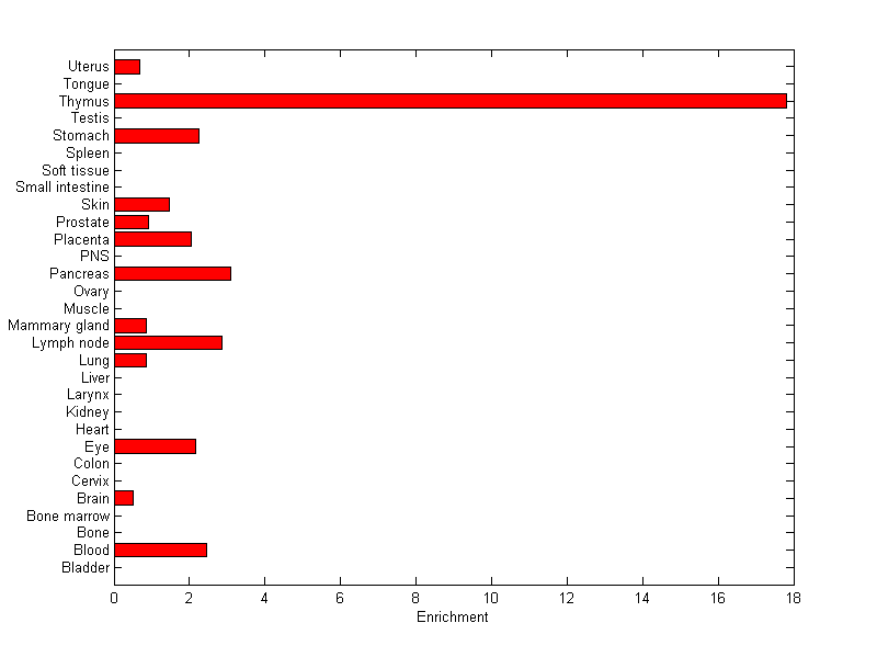 The expression level is normalized with tissue-library size. Each value for a gene in a tissue is a ratio of observed ESTs to the expected one in this tissue. The expected number of ESTs is the product of total ESTs of the gene and the fraction of total ESTs in the tissue among all ESTs in 30 tissues.